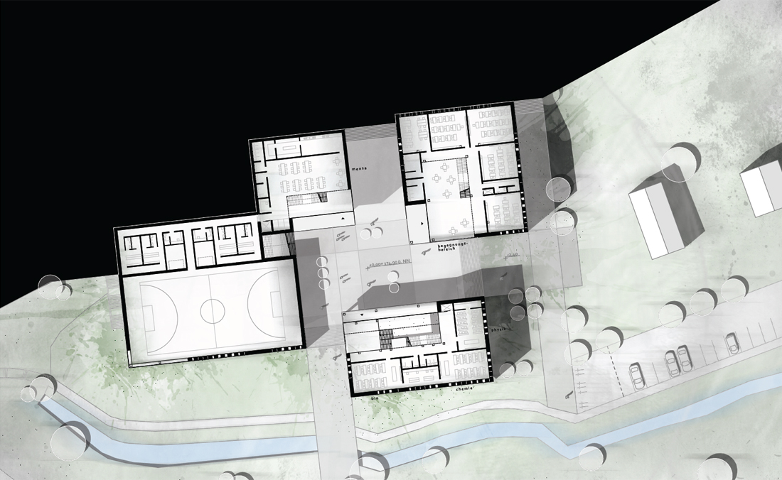 STRUKTUR Infolge des schlechten Zustandes des Umkleideriegels wird dieser in den nördlichen Teil der sanierungsbedürftigen Halle verlegt und die beengte Situation im rückwärtigen Bereich entschärft. Er fungiert unterirdisch als Bindglied zwischen dem neuen Baukörper und der Turnhalle, oberirdisch als Vorplatz der eine einladende Eingangssituation für den Neubau darstellt. Die bisher unklare Zugangssituation wird damit verlegt und klar strukturiert. Desweiteren wird die grüne Zunge entlang des Bachlaufs weitergeführt, sodass sich eine parkähnliche Campussituation ergibt.